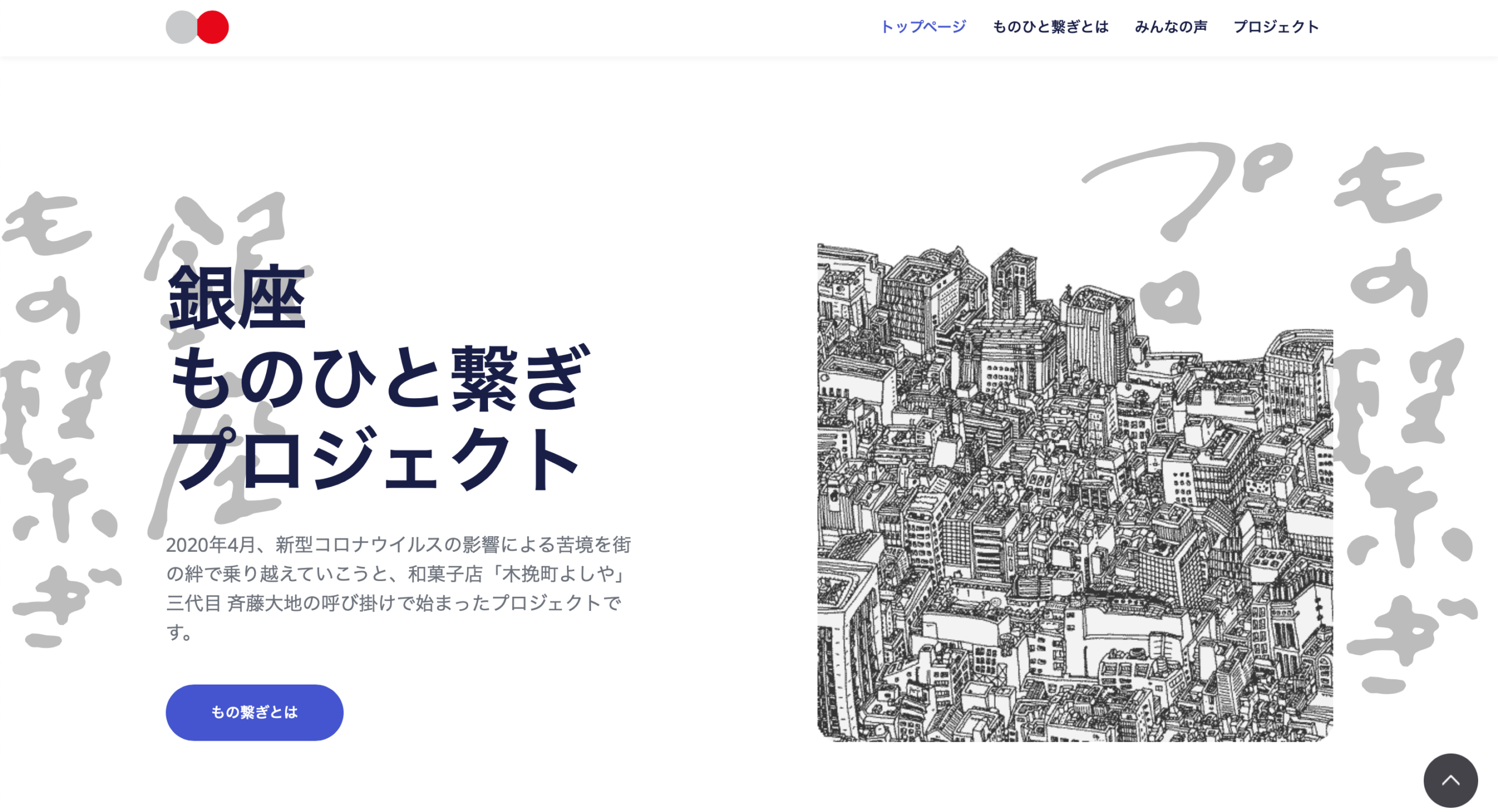 銀座2021.10.01 銀座 公式ウェブサイト 公開 2021年10月1日、「もの繋ぎ・ひと繋ぎプロジェクト」の公式ウェブサイトを開設しました。 銀座 銀座ものひと繋ぎプロジェクト 2020年4月、新型コロナウイルスの影響による苦境を街の絆で乗り越えていこうと、和菓子店「木挽町よしや」三代目 斉藤大地の呼び掛けで始まったプロジェクトです。